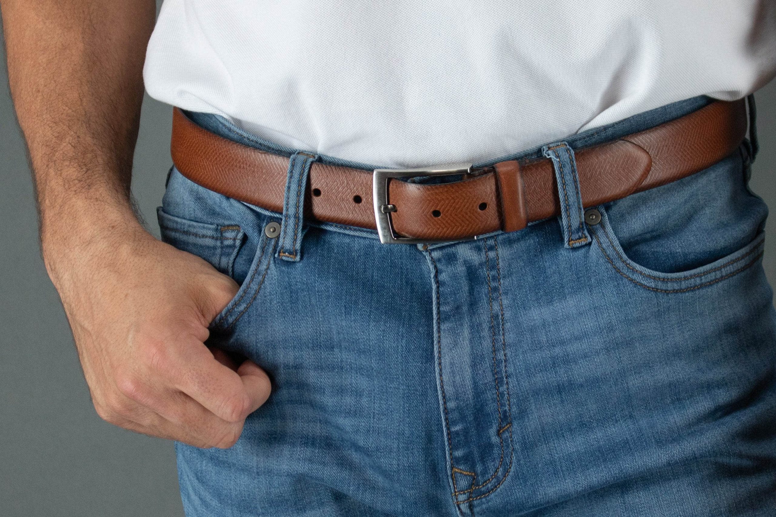 The Gregorio Herringbone Embossed Feather Edged Leather belt is a must-have for every man’s wardrobe. This versatile belt is handcrafted in the USA with meticulous detailing in the herringbone design. The classic herringbone embossing is simple and distinguished, making it suitable to match with a suit, but also casual enough to pair with jeans or khakis. The leather belt features a feather-edged and silver buckle with a single keeper completing your attire. Please remember that when ordering your belt, order one size larger than your waist size. For example, if you wear 34-inch waist pants, please order a belt in the 36-inch size.